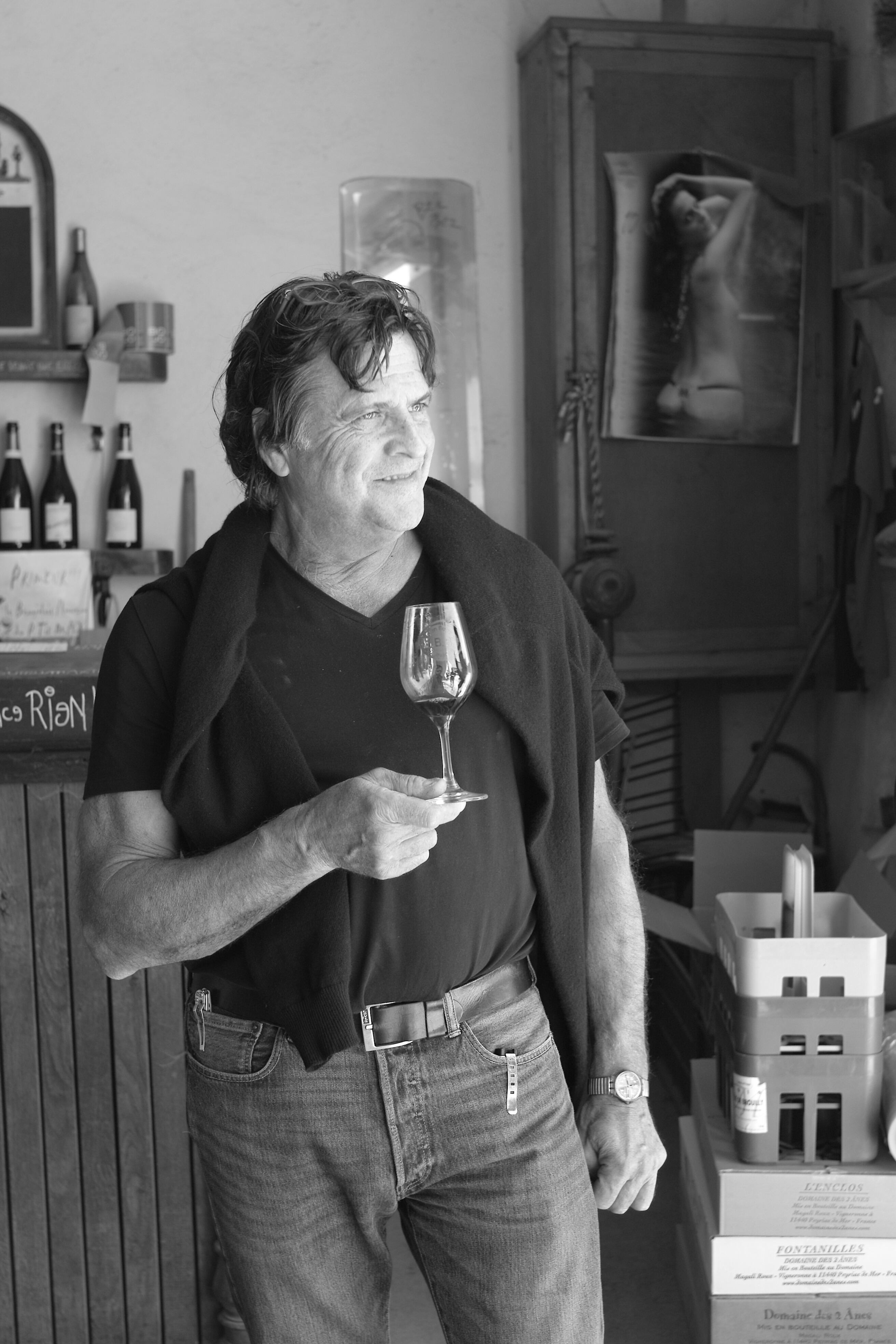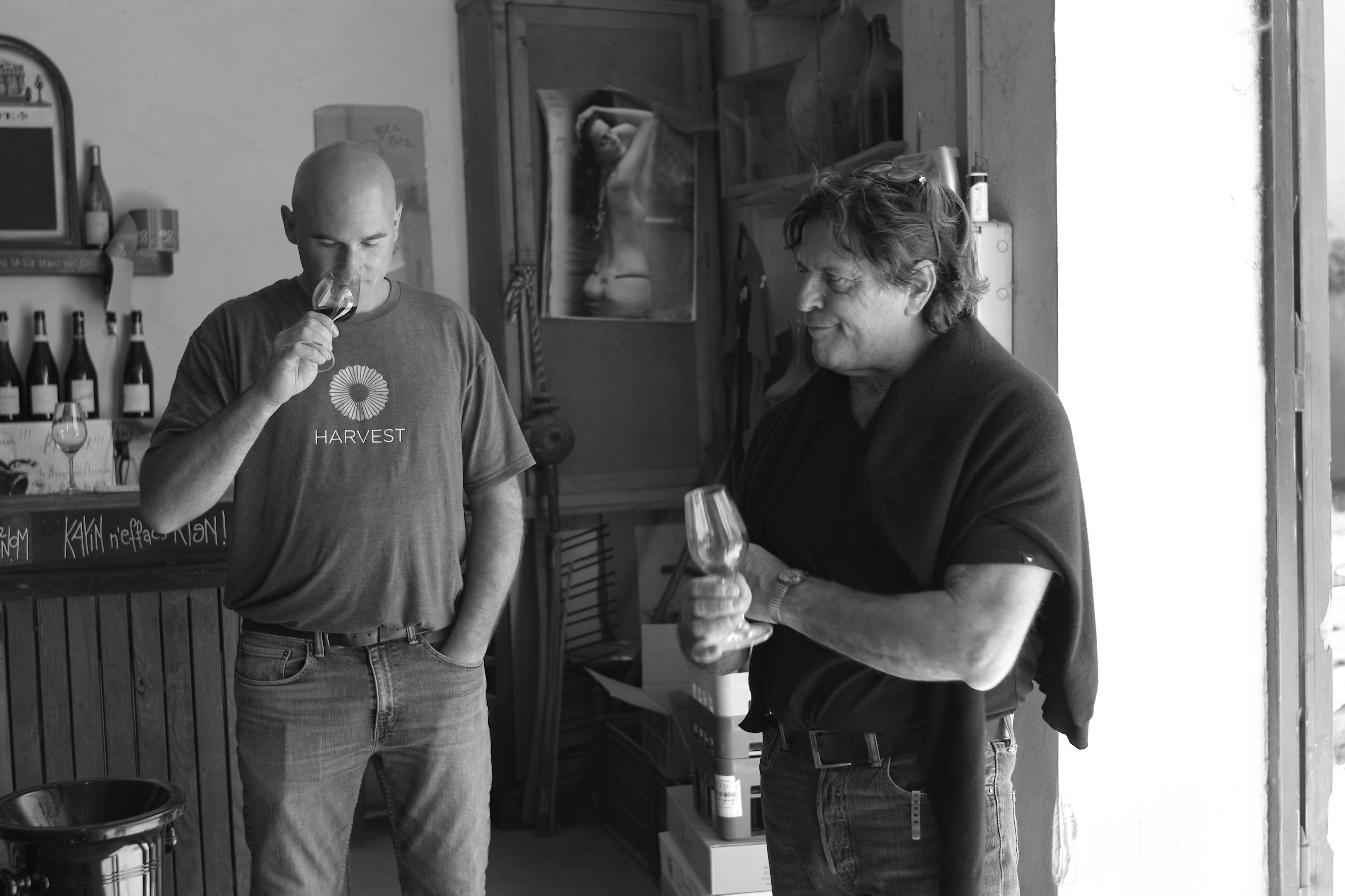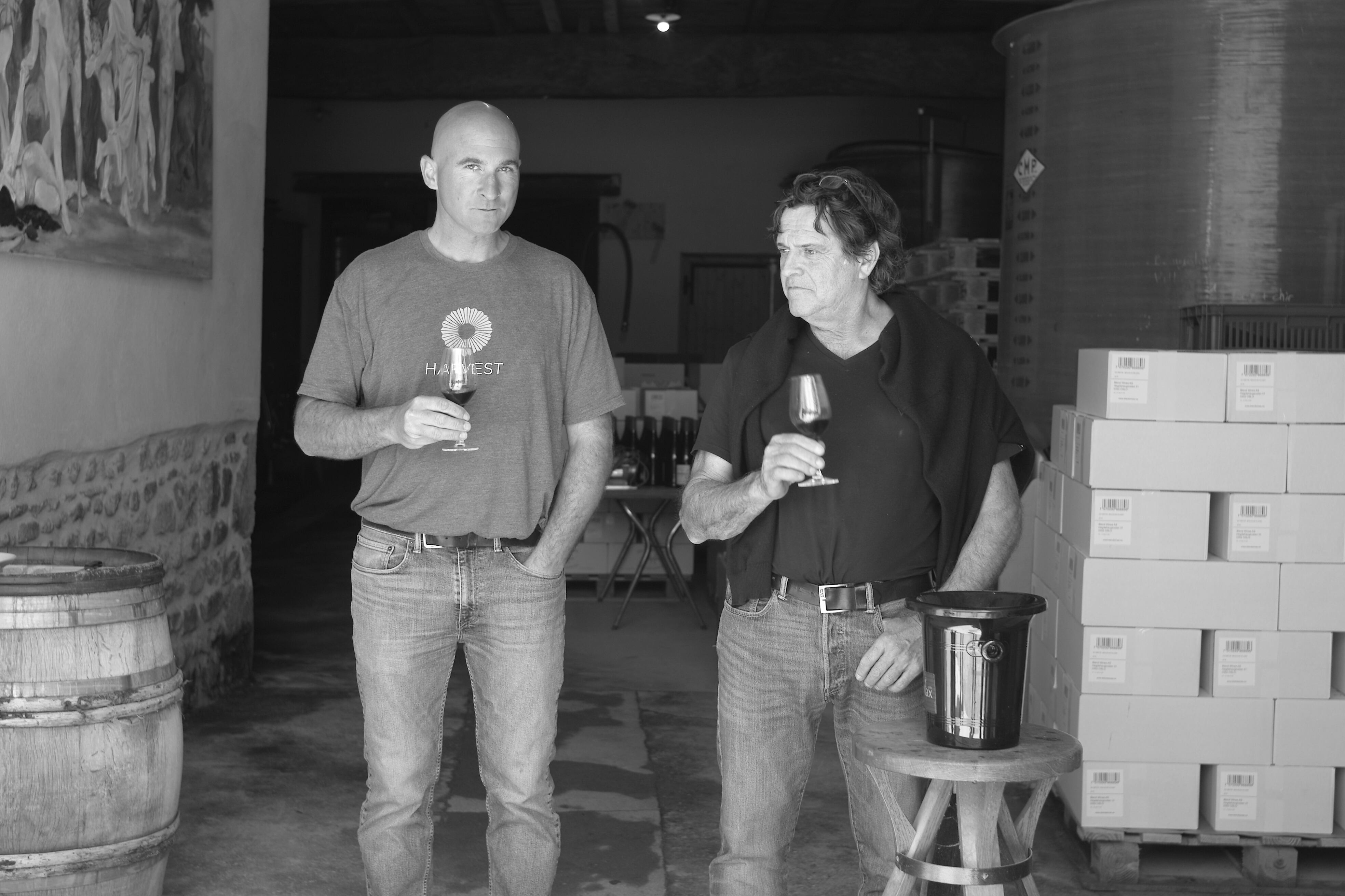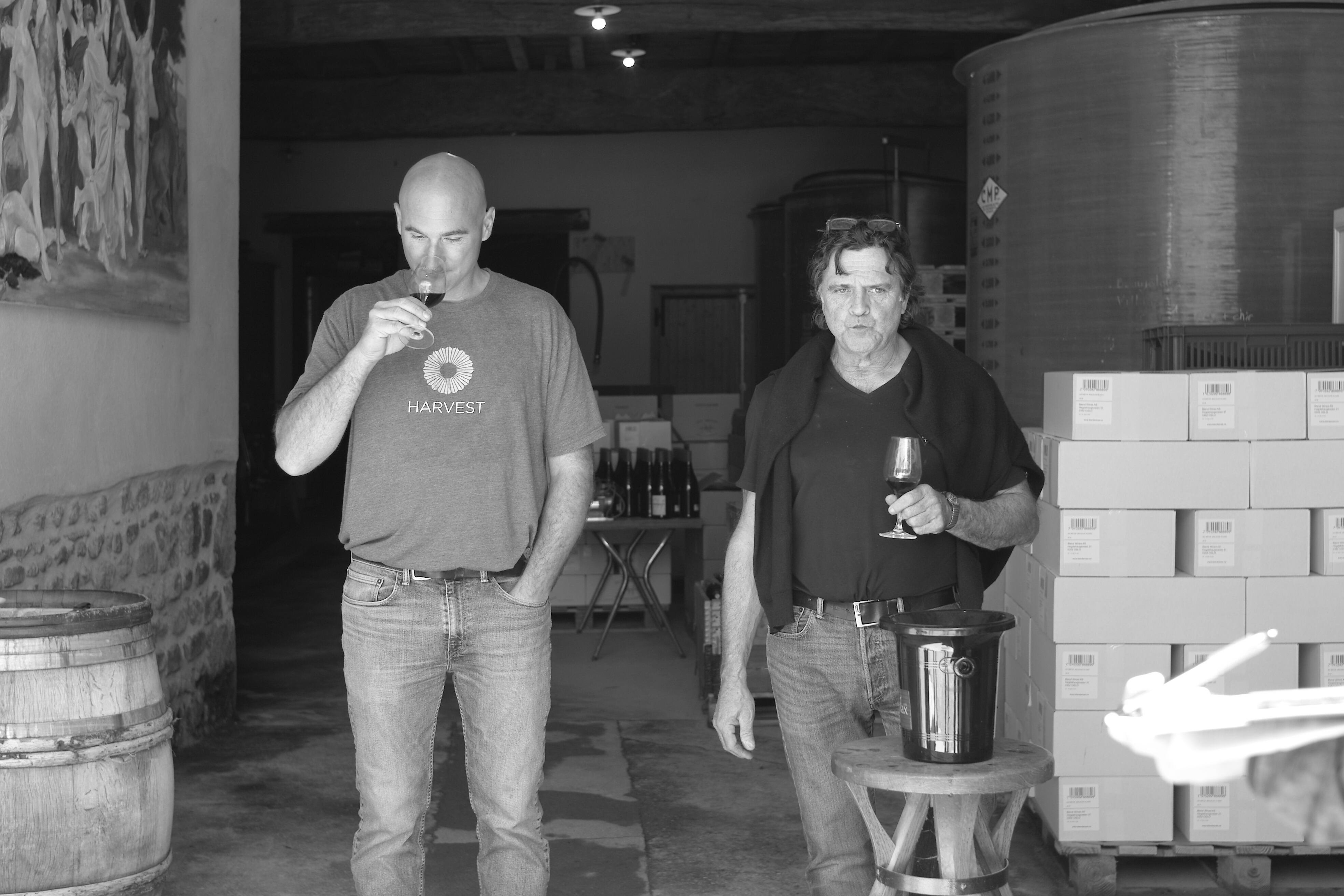 畑の土壌は主に粘土石灰質で区画によっては樹齢100年を超えるものもあります。除草剤は一切使用せず、土壌の違いや樹齢の違いごとにキュヴェを分けて醸造します。収穫は手摘みで除梗はせず、マセラシオン カルボニックと アルコール醗酵はコンクリートタンクまたは琺瑯タンクでアロマを引き出す為に約30日間かけてゆっくりと行われます。昔ながらの圧搾機で16時間かけて圧搾し、熟成用の旧樽にはDRC社から譲ってもらった2、3年樽を使用しています。亜硫酸は瓶詰の段階で微量使うのみで、コラージュ、フィルター共に行いません。